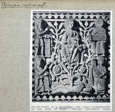 Műlap - elefántcsont dombormű Jessze fájának korai ikonográfiai ábrázolásával egy írószekrény lapján