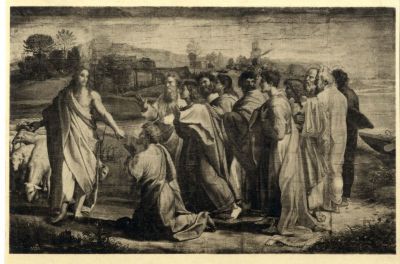 Műlap - Jézus átadja Péternek a Mennyország kulcsait, gobelin Raffaello kartonja után