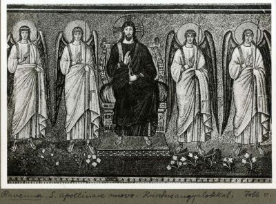 Műlap - Sant'Apollinare Nouvo, trónon ülő Krisztus angyalokkal mozaik