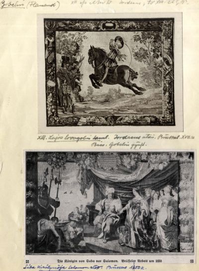 Műlap - XIII. Lajos vovagolni tanul, valamint Sába királynője Salamon előtt. gobelin
