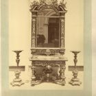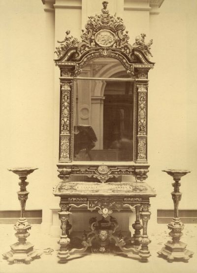 Műtárgyfotó - gyöngyház-és teknőcberakással díszített asztal, tükör és gyertyatartók az 1876. évi Műipari Kiállításon Coburg Fülöp herceg gyűjteményből
