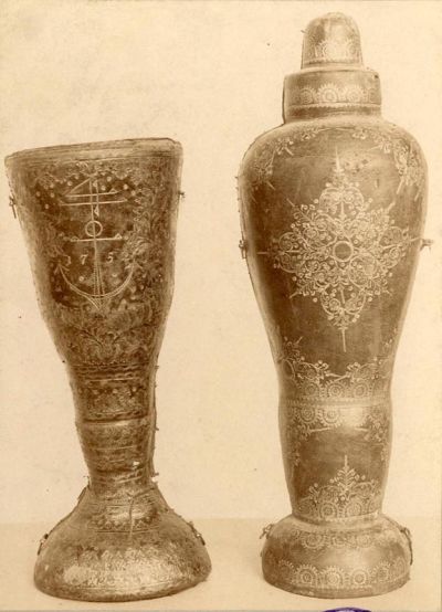 Műtárgyfotó - serlegtok, bőr, aranyozott díszítéssel, magyar, 1752 és fedeles serleg tokja, bőr, aranyozott díszítéssel, magyar, XVIII. sz.