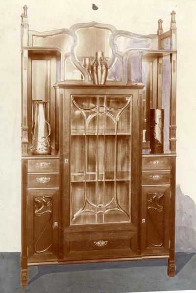Az Iparművészeti Társulat 1900. évi karácsonyi kiállításán bemutatott szalonberendezéshez tartozó díszszekrény az angol bútorművesség hagyományait eleveníti fel – magyar környezetben. Az ólomkeretes, metszett üveggel díszített központi ajtót nyitott polcok, fiókok és zárt tároló részek veszik közre.