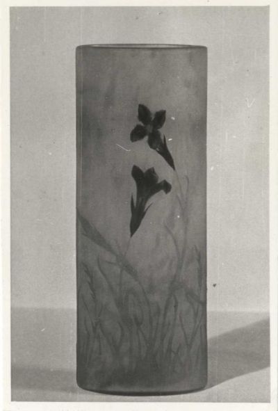 Műtárgyfotó - váza, többszínű felhőzött és matt üveg, liliomokkal a Daum fivérek gyárából, 1900 k.
