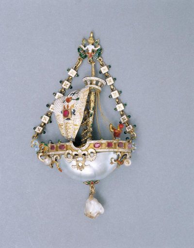 A násfa hajótestének míves, rubinokkal foglalt, zománcos díszű tartóláncai ötletesen megformált függesztő elemhez: egy szirénfigura kettős halfarkához csatlakoznak. A hajó testét gyöngyházkagyló képezi, az oldalát zománcozott, rubinos, sárkányorrú fedélzet-káva adja, a padlózatát pedig fekete beágyazott zománcmustra ékíti. Árbocára leveles zománcinda tekeredik, fehéren zománcozott vitorláját nyíllal átlőtt szív, alatta égő rubin-szív uralja, kötélzetén egy-egy piros-fehér ruházatú matrózfigura tüsténkedik. A hajófenékről méretes barokkgyöngy, míg a hajó két végén egy-egy további gyöngy függ alá.