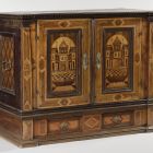 Az ajtóban két szimmetrikus ideál-architektúrát látunk, távlati hatást keltő vedutát. A kép mélységét fokozza a térben ábrázolt kockakövezet. A zsámolyban lévő két fiókon, az oldalsó pilasztereken és ajtókon mértanias díszítősávok. Az oldalakon berakott négyzetes fenyőfa keretben sablonnal festett geometrikus minta, rombuszhálós tusfestés. A fogsoros párkányon nyugvó, jelenleg hiányzó felsőrész az alsóval azonos kialakítású volt. Hasonló berakott díszítése van az Iparművészeti Múzeum egy ládájának (ltsz. 64.100).