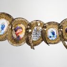 A „Romani Circle” nyaklánc a Kortárs Design Osztály által 2018-ban útjára indított Körforgásban c. kiállítás-sorozat keretében jött létre. Koncepció szerint a felkért tervező kiválaszt egy tárgyat vagy tárgyegyüttest az Iparművészeti Múzeum gyűjteményéből, melynek inspirációjára saját dizájnt hoz létre. Negyedik meghívottunk a Romani Design a világ első roma divatstúdiója. A dizájnerek összesen hat műtárgyat választottak a múzeum gyűjteményéből (20142.b; 20129; 88.230.1; 88.301.1; 89.324.1; 2010.59.1). Nem véletlen, hogy ezek mind Szűz Máriát vagy női szenteket ábrázoló szentképek, melyek inspirációjára hat elbűvölően gazdag mintázatú női öltözéket és hozzájuk illeszkedő kiegészítőket készítettek az alkotók (ld. még: 2021.515.1; 2021.516.1-2; 2021.517.1-2; 2021.518.1-2; 2021.519.1; 2021.520.1; 2021.522.1).