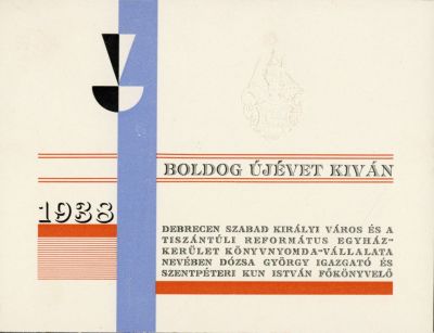 Alkalmi grafika - Újévi üdvözlet: Dózsa György igazgató, Szentpéteri Kun István főkönvyelő, Könyvnyomda vállalat, Debrecen