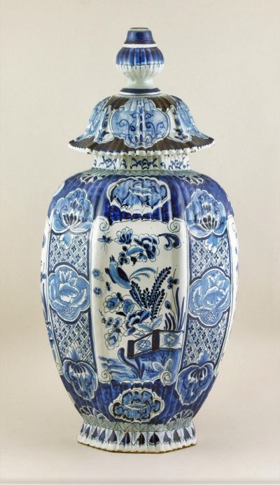 Nyolc oldalú, felfelé szélesedő, tojás alakú, vékony nyakú díszedény. Oldalán kobaltkék virágos, madaras díszítmény váltakozik rozettás, ferde rácsos díszítményű sávokkal. A díszítmény a fedőn folytatódik, melynek magas gombja erősen tagolt. Jellegzetes chinoiserie alkotás.
