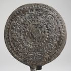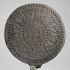 A kerek középmezőt tizenkét vésett puttófigura övezi. Vésett címere - négyelt pajzs, a négy mezőben egy-egy rozetta - nem azonosított.