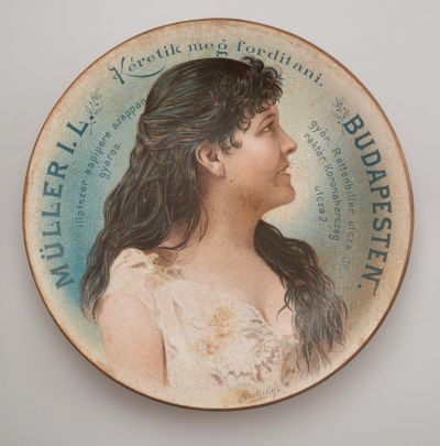 Préselt papírtálca, fényes, színes nyomattal díszítve. A nyomaton Blaha Lujza „ Királyfogás ” címszerepében Fotó: Strelisky Lipót, 1896 A tálca peremén Müller J .L. illatszer és pipereszappangyáros hirdetése gyár: Rottenbiller utcza 36. raktár: Koronaherczeg utcza 2. Hátlapon: Müller J .L. -féle Poudre de Serail hirdetés