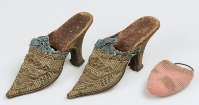 A felső rész lábfejhez közel eső részére világoskék vászon szövésű, húzott selyem szalagot varrtak két sorban. Magas fa sarkát barna bőrrel vonták be, a talprészen és a talp felé eső oldalán fémmel merevítették. A talp barna bőrből készült, felbolyhozott. A talpráma sötétebb színű bőr, fehér varrás tartja. A sarokrésznél sötétebb színű bélés.