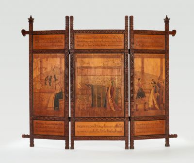 A keretet dúsan vésett-faragott díszítmények, X-ek, hullámok, virágok borítják. A függőleges elemek a kereten túlnyúló, kopjafákat idéző tagozatban végződnek, a díszítőmotívumok az erdélyi folklórból származnak. A kereten belül középre a metszett-égetett-festett kép, alulra és felülre szöveges mező került. A történelmi-mondai hagyományt megelevenítő bútordarab bútorművészeti jelentősége mellett fontos tanúja a korszak eszmetörténeti áramlatainak is.