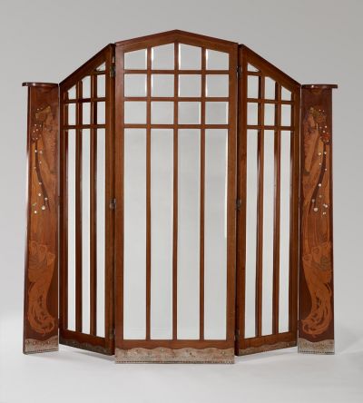Az ötrészes, metszett üveglapokkal áttört, háromszög záródású ellenző valódi dísze a kétoldalt elhelyezett intarzia. A profilban ábrázolt, fedetlen keblű, nyújtott, kecses nőalakok hullámzó hajéke és ruházata a skót Charles Rennie Mackintosh vagy a Wiener Werkstätte művészeinek - főként Kolomann Moser - alakjait idézi fel.