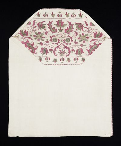 Technika: | selyemmel lefogott fémfonalas hímzés; szakaszos hamis laposöltés; száröltés |