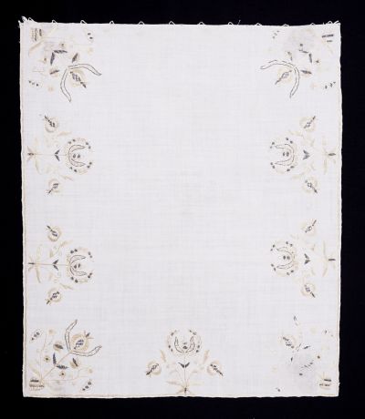 Anyag: | ezüstszínű fémfonal; selyemfonal; vászon |