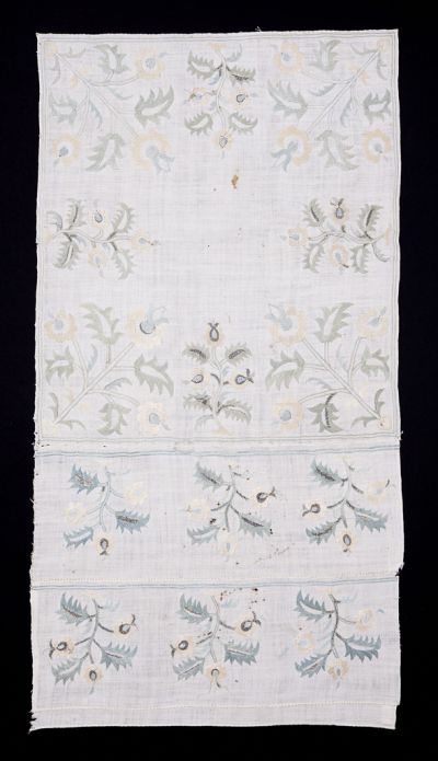 Anyag: | ezüstszínű fémfonal; selyemfonal; vászon |