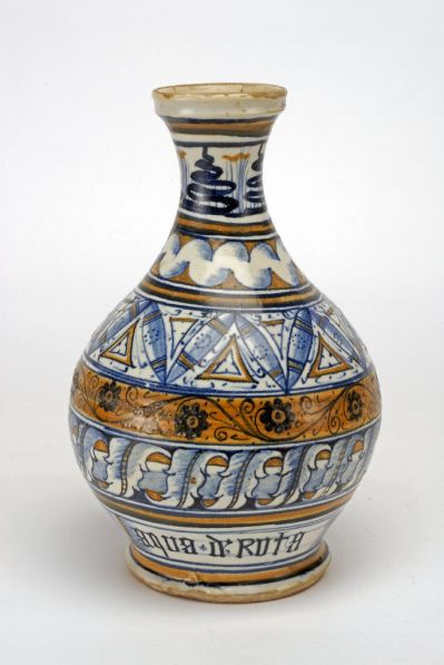 Keskeny, tagolt talp fölött gömb alakú test, karcsú, tölcséres nyak. Szájpereme kissé kihajló, tagolt. Felületét hat körbefutó sávban különböző motívumok díszítik. A talp fölötti sugaras mezőben gótikus minuszkulával írt felirat, gyógyszernév: aq[u]a de rota. Az ezt követő széles sávban pálcára csavarodó, stilizált levélsor fut körbe, az edény hasán körbefutó narancsszín sávban stilizált bryonia-virágos, leveles indasor, majd zegzug vonalban elhelyezett orsók, közöttük háromszögek. Hasonló eszközöket használhattak a halászhálók csomózásához.