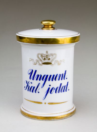 Jelzés: | alján, száraz bélyegzővel benyomott bajor címer; a masszába karcolva: 20; a masszába nyomva:.; fekete írott betűkkel: Nymphenburg 1700 végén / Kgl. Bayer. Leib-u. / Hofapotheke / München |