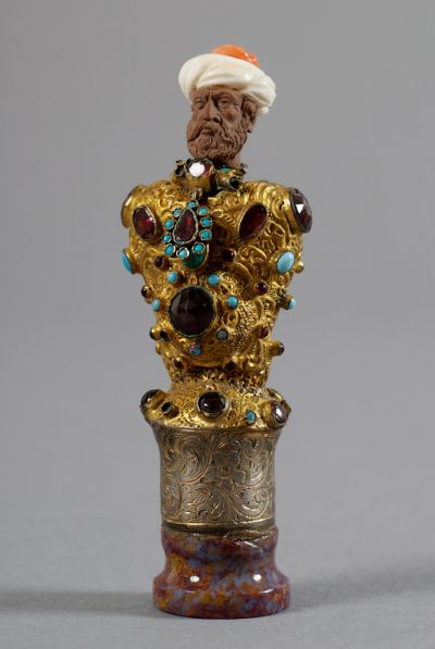 A pecsétnyomó felső része férfi büszt, mellén domborított kagyló- és levélmotívumos díszítés. Szakállas feje terrakotta, rajta csontból és korallból faragott turbán. A büszt teljes felülete befoglalt türkizekkel és almandinokkal borított, hengeres talapzata aranyozott ezüst, vésett leveles-csigás díszítéssel. A pecsételő szintén hengeres, tagolt kékes-vörösesbarnás jáspis, bevésett - még meghatározásra váró- címerrel: hétágú koronából kinövő szarvas, amint mellső lábaival egy fához támaszkodik.