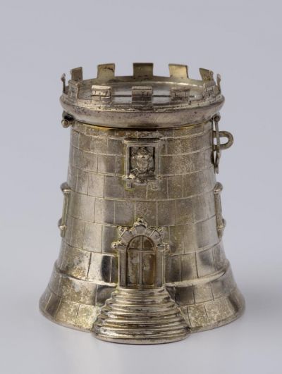 Alacsony, hengeres bástyát utánzó forma, elöl félkörívvel lezárt kapuval és lépcsőfeljáróval. A kapu fölötti ablakból plasztikusan megformált női fej néz ki. Körben még három ablakdísz, teljes felülete téglát imitáló vésett díszítéssel. Fedele leemelhető, tetején a pénz bedobására szolgáló nyílással.