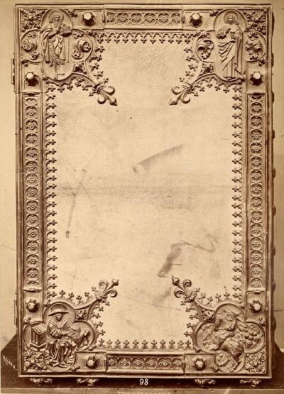 Műtárgyfotó - 15. századi bőrkötésű antiphonale az 1876. évi műipari kiállításon a győri szeminárium gyűjteményéből