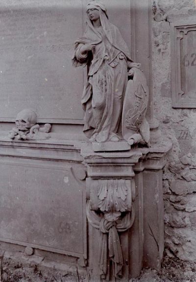 Fénykép - sírkő részlete, pajzsot tartó nőalakkal, koponyával,soproni evangélikus temető, XIX. sz. vége