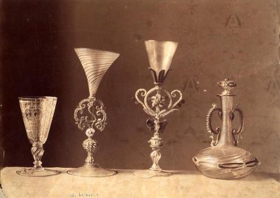 Fénykép - talpas kelyhek és palack,üveg, Velence, XVI. sz., Iparművészeti Múzeum