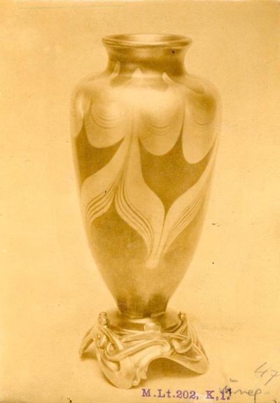 Fénykép - váza ezüst talapzaton, irizáló üveg, Tiffany, 1900 körül