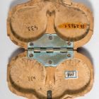 Lapos, ívelt peremű  csuklós szerkezettel nyílik. Oldalain indák, kagylók közé komponált férfi, illetve női profil medalionban.
