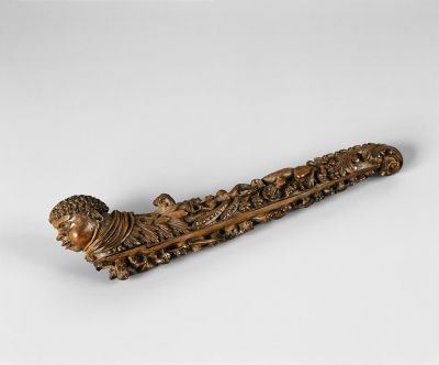 Egyik végén kiszélesedő, hengeres forma, alja lehúzható. A háttérből szinte teljesen kiemelkedő, plasztikusan, helyenként áttörten faragott tok fedelén akantusz levélen, virágos ágak között ülő béka kagylóba komponált ruhátlan Vénusz alakot tart. Csúcsán fülbevalós néger fej. Lehúzható alján makkos, indás-virágos ágak között majmok, lándzsás emberalak, kezében jogart tartó, tollbokrétán trónoló néger figura követi egymást.