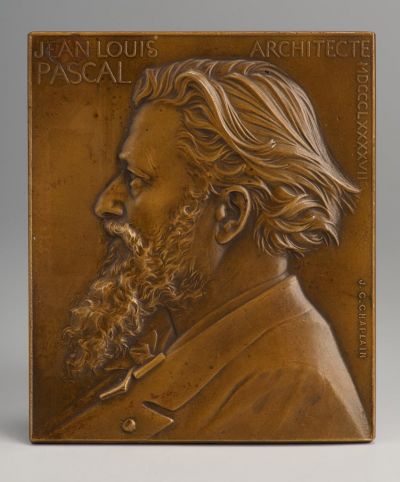 Előoldalán szakállas, hosszú hajú, balra néző férfi profilja, felette felirat: „JEAN-LOUIS PASCAL ARCHITECTE".