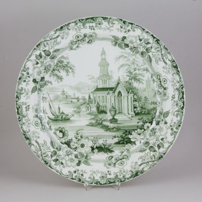 A használati célra készült, de az ebédlők díszítésére is alkalmazott, nagyméretű lapos tányér tükrében a metszet romantikus tájat ábrázol. Az előtérben aszimmetrikusan, vízbe nyúló földnyelven, ligettel körülvett, gótizáló templom, keleties toronnyal, mögötte a zárdához tartozó egyéb épületek, előtte kikötő, háttérben hegyek, csipkézett vízpart. A kikötőben baldachinos, keleties toronydíszű hajó érkezik, vitorláját éppen lehúzza az egyik figura, egy másik az ölében tart egy nőalakot. A tányér peremét körben virágzó vadrózsaágak és apró virágok borítják dúsan, a szegélyező rocaille és geometrikus szalagsor között lazán, szabadon elrendezve.