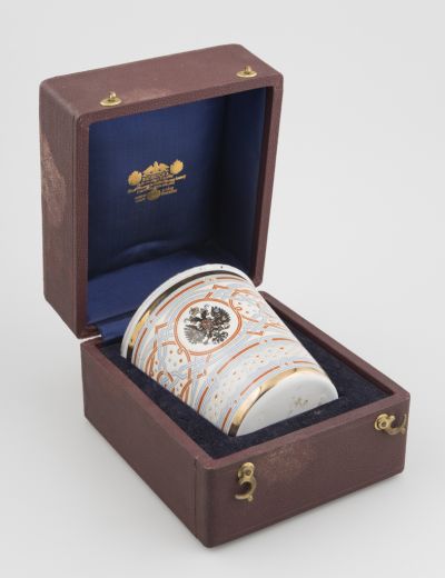 Pohár - a cári kétfejű sas alakjával, II. Miklós cár monogramjával, selyembélésű műbőrtokban