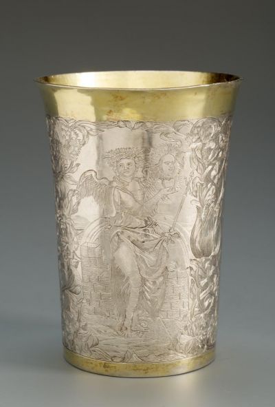Felfelé enyhén kiszélesedő, hengeres forma. Vésett díszítése: gazdag levél- és virágdísztől övezett három álló, allegorikus nőalak: az Irigység, a Balszerencse és a Keresztény hit győzelmének megszemélyesítői. A három figura a nürnbergi reneszánsz "kismesterek" egy-egy rézmetszetének pontos másolata: 1: Georg Pencz (Bartsch, 141 - ld. itt), 2-3: Hans Sebald Beham (Bartsch, 128, 130 - ld. itt és itt) nyomán.