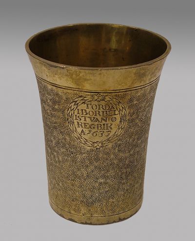 A pohár felületét cápázott, azaz poncolással sűrűn kivert, cápabőrre emlékeztető díszítés tagolja. Elöl levélkoszorúban dedikációs felirat: TORDA/I BORBEL/ ISTVAN Ö/REGBIK/ 1633.