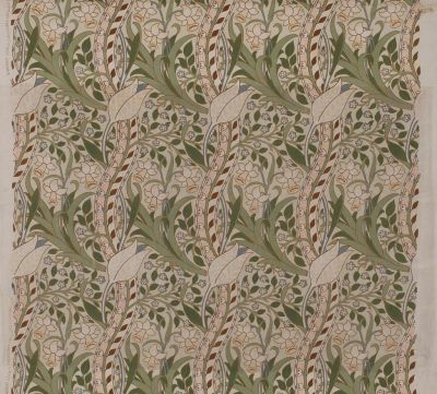 Fehér alapon sötét okkerrel kontúrozott, világos drappal, okkerrel, kétárnyalatú zölddel és világoskékkel nyomott. A szövet hosszában párhuzamosan futó vastag, gyöngyvirágos hullámindákból nárcisztövek és nefelejcságak hajlanak ki, az indát hatalmas fejű, ívelt szárú tulipánok fonják körül. További példányok, ill. színvariánsok a londoni Victoria and Albert Museum (ld. itt), a krefeldi Deutsches Textilmuseum gyűjteményeiben (Menzel 1977, Nr. 4. - tévesen William Morris utolsó tervének tartva). Az eredeti mintarajz és a fadúcok a William Morris Gallery (Walthamstow) tulajdonában.