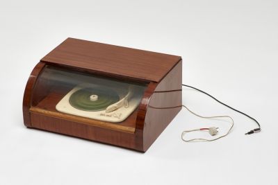Lemezjátszó fa szekrényben. Az IM805K modelleken a lemezjátszó tálcáján volt egy „IMI” felirat, áramvonalas, stilizált betűkkel. Erről a darabról ez hiányzik, a hajdani rögzítés nyomai azonban még láthatók.