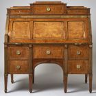 Nyolc, lefelé vékonyodó, négyzetes hasáb alakú lábon áll, melyek feljebb kannelúrázott lizénákban folytatódnak. Alsó részében két-két oldalsó fiók között egy középső fiók. A három négyszögletes, mélyített betéttel tagolt redőny az alatta lévő írólap kihúzásakor hátracsúszik. Az íróasztal belsejében öt kis fiók és négy nyitott polc látható. Az íróasztalt háromfiókos felépítmény koronázza, a középső fiók magasan kiemelkedik. A fiókok tetején lépcsőzetesen kialakított, hasábos lezáró tagok. A lábazat aranyozott bronz kannelúrákkal és korongokkal, a középrész széles bronzszalagokkal díszített. A fiókok és a két oldalfal betétmezőit gyöngysorléc keretezi, a kulcslyukakat nyolcszögletű, bronz fiókhúzók fedik.