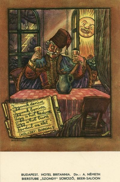 Reklám képeslap - Hotel Britannia, Budapest, Bierstube „ Szondy” Söröző, Beer-Saloon