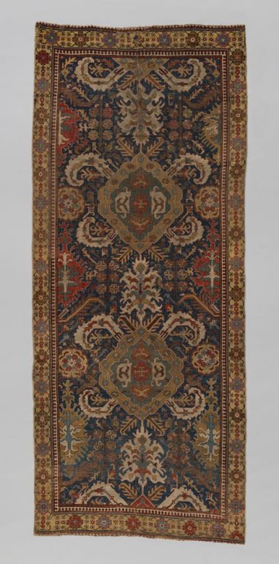 Az Iparművészeti Múzeum korai karabagi medalionos és sarlós levelű szőnyege Dr. Delmár Emil (1876-1959) tulajdonából került a gyűjteménybe. Mintázata arányos rajzú, középmezejét sötétkék alapon két teljes medalion, az alsó és a felső végén egy-egy medalion-kezdet díszíti. A medalionok kampós, lándzsalevelű karjai nyers színűek. A medalionokat rojtos szélű, nyers színű palmetták kapcsolják össze. A kék alap szabadon maradó felületét rozetták, virágok és levelek töltik ki.