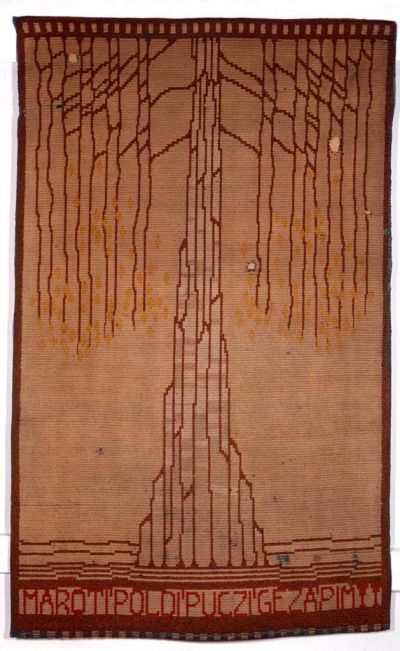 Nyersszínű alapon, barnával kontúrozott hatalmas, stilizált nyírfa. Alsó szegélyén vörös színű nagybetűs felirat: MARÓTI / POLDI (Maróti felesége, Fritz Leopoldina) / PUCZI (Maróti leánya, Dóra) / GÉZA / PIM, valamint két talpas pohár. A szőnyeg Nyírfa című akvarelltervét a Finn Építészeti Múzeum (Museo Suomen Rakennustaiteen) őrzi.
