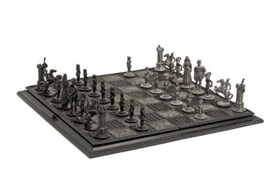 A sakk-készlet kuriózum a maga műfajában, s érdekes példája a 19. század végének historizáló irányzatán belül megmutatkozó stíluskeveredésnek, mivel a viaszvesztéssel öntött figurák öltözéke különféle történelmi korok divatját idézi. A király zsinóros zekéjében, vállára vetett köpenyével a 19. század romantikus-historizáló magyar plasztikáiról ismert Szent István király-ábrázolásokra vezethető vissza. A királynő Zrinyi Ilonát személyesíti meg, hosszú szoknyát, fűzött derekat, gyöngysort és fátylat visel. A huszárok a kuruc vitézek hagyományos pózában, ágaskodó lovakon ülnek zsinóros huszárruhában, sapkával, kezükben ostorral. A futárok tunikaszerű viseletét bojtos sapka egészíti ki, a gyalogok pedig Zsigmond-korabeli apródruhában, két kézre fogott lándzsával, feszes vigyázzban állnak.