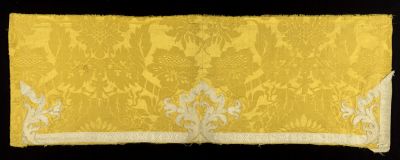 Technika: | applikált; damaszt-szövés; zsinórral szegett |