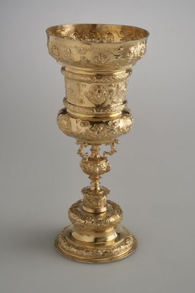 Tagolt kerek talp, stilizált díszváza alakú nodusz. Makk alakú edénytest, maszkos, virágdíszes, gazdagon trébelt ornamentika, melynek motívumai az 1550-1600 körüli német grafikai alkotásokra jellemzők.