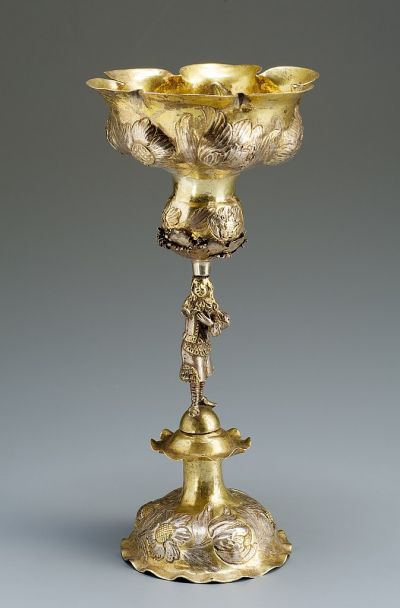 Kerek talpa magasan domborított, trébelt díszítésű. Szára álló férfialakot formáz. A kuppa harangvirág idomú, trébelt, a talpéhoz hasonló motívumokkal – stilizált levélmotívumokkal – díszített.