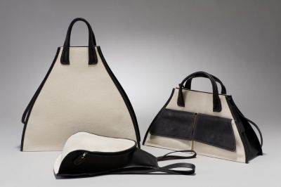 Kaliczky Katalin korunk egyik legnevesebb bőr- és textiltervező művésze Magyarországon. E tárgyakon is megcsodálhatjuk rendkívül letisztult, visszafogott, mégis elegáns formavilágát. Mindhárom táska anyaga nyersszínű textil, fekete bőr rátétekkel kombinálva. Formaadása invenciózus, egyszersmind kiválóan alkalmazkodik a műfaj és a felhasznált anyagok – bőr és textil – sajátosságaihoz.