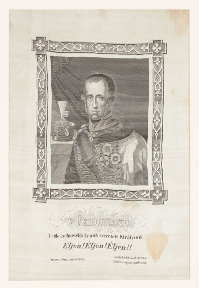 Zöldesszürke alapon a szürke árnyalataival szövött. Sarkaiban rozettával, oldalain liliomos csürlővel díszített képkeretben V. Ferdinánd mellképe. Ez utóbbi az uralkodót zsinóros dolmányban, bal vállára vetett, prémmel szegett, zsinóros, érdemrendekkel dekorált mentében ábrázolja. A háttér redőzött, bojtokkal díszített drapéria, előtte állványon zsinóros, tollbokrétás süveg. A keret alatt beszövött felirat: V. FERDINÁND / Legkegyelmesebb Urunk szeretett Királyunk, / Éljen! Éljen! Éljen! / Pesten Juliusban 1846 mély hódolással ajánlva / Valeró selyem gyárából.