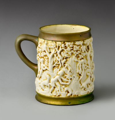 Technika: | csontszínű mázzal fedett; domborműves díszítés; eosinmázas; öntött és mintázott elemekkel (feltehetően); savmaratott mázas |