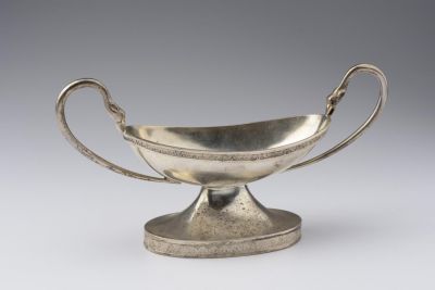 Ovális talppereme vésett palmettás díszű, fölötte kúposan emelkedő sima tagozathoz közvetlenül kapcsolódik a peremén sáslevelekkel díszített csésze. Két füle öntött, hajlított, s egy-egy állatfejben végződik.